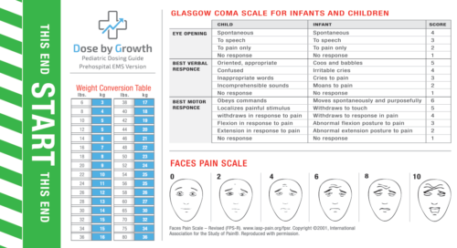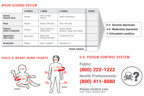 Useful Visual Aids – Ped/Inf Burn Chart, FACES™ Pain Scale, Ped/Inf GCS, APGAR, Infusion Drip Charts, LBS – KG Conversion Chart, Poison Control contact, etc.