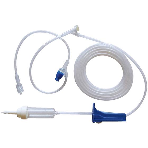 Needle-free administration neutral displacement technology, creating a safe, protective barrier in the IV connector. This set serves to lessen the risk of bacterial contamination or infection during procedures. Also has a cork port for administration by needle. Adoption of this innovative technology may lead not only to safer patient outcomes, but improved cost of care.