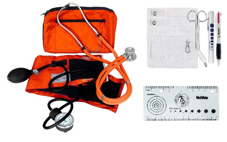 - Nylon pocket organizer, bandage scissor, disposable penlight, Medimeter, and a 3-color chart pen.