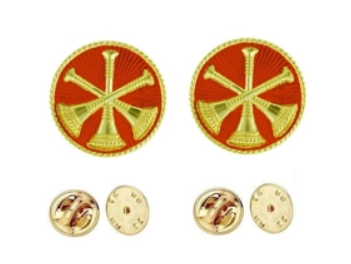Crafted with meticulous attention to detail, these Gold Rank Pins feature a striking design that includes three crossed bugles, symbolizing leadership and authority. The vibrant Red Enamel Collar Pins add a pop of color, making these pins not just functional but also a decorative accessory that enhances your uniform. The decorative rope border adds an elegant touch, ensuring that you look sharp and professional at all times.